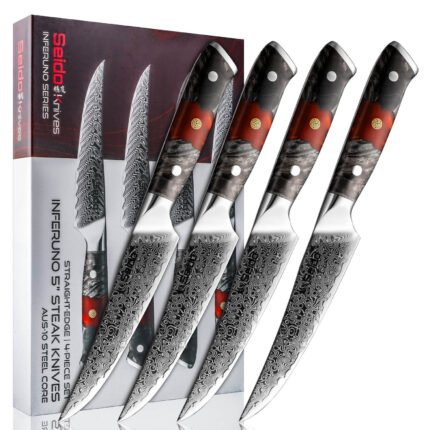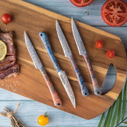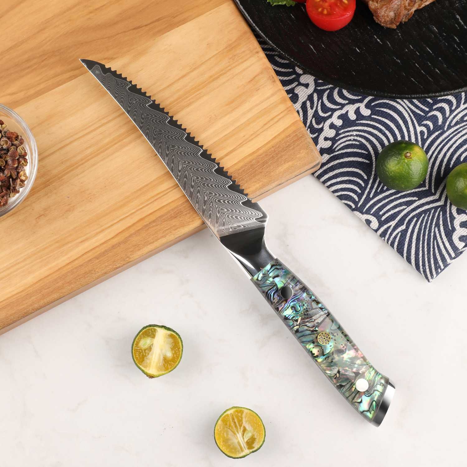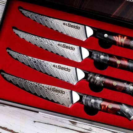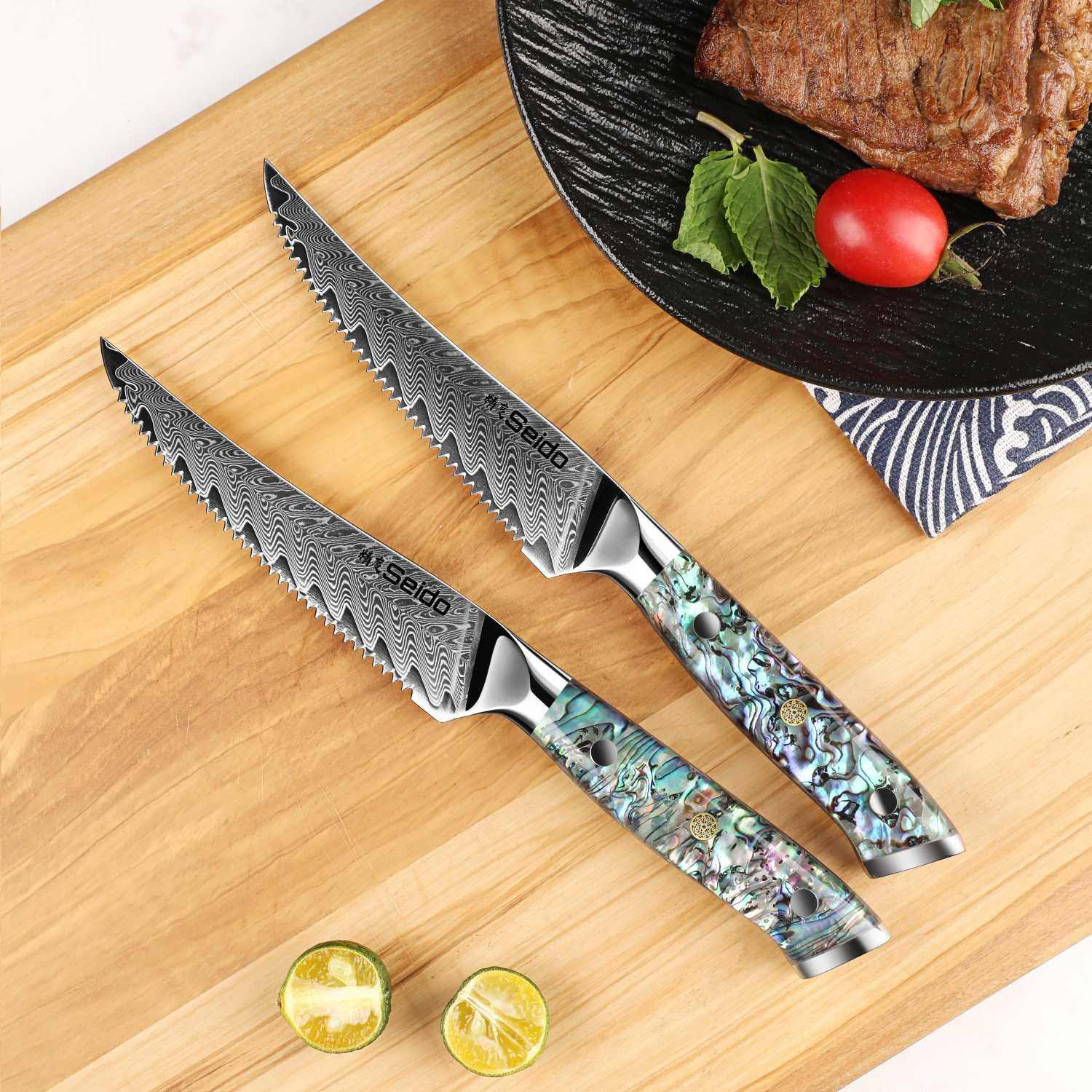 Support from 8:30 AM to 10:00 PM everydayMeet the Awabi Series Serrated Steak Knives — statement-worthy table knives that glide through crust and sear without tearing tender centers. A razor-tough VG-10 steel core. 67-layer Damascus cladding. and luminous abalone shell resin handles deliver clean cuts and dinner-table wow. Choose a 4-piece set for weeknights or an 8-piece set for hosting.