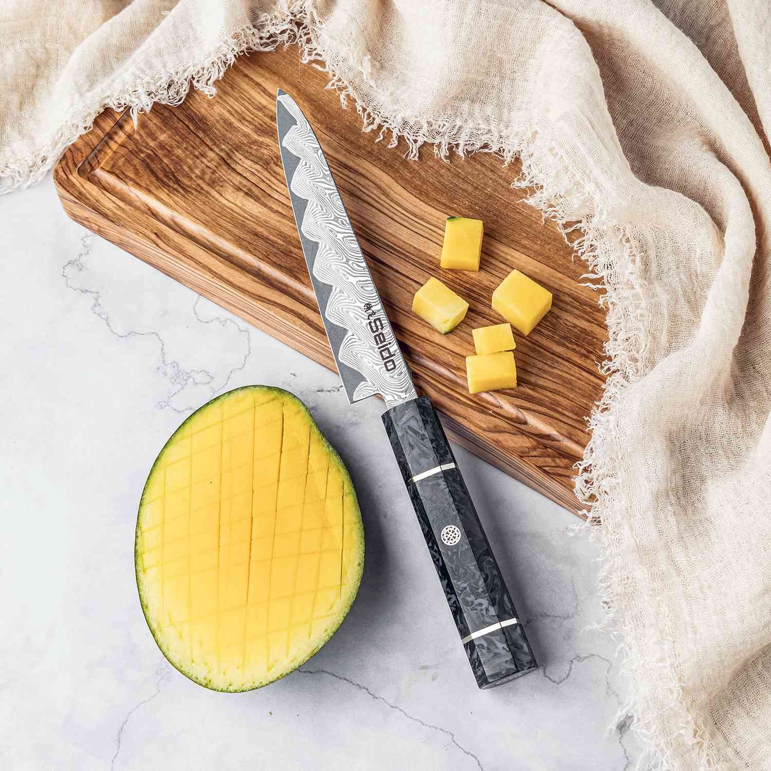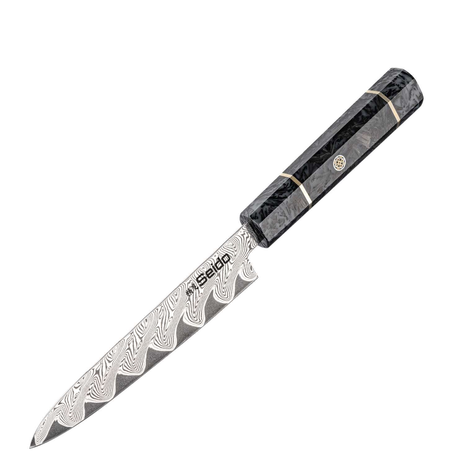 Epokishi 5 petty knife with a grey resin and carbon fiber handle and damascus blade displayed a white background.
