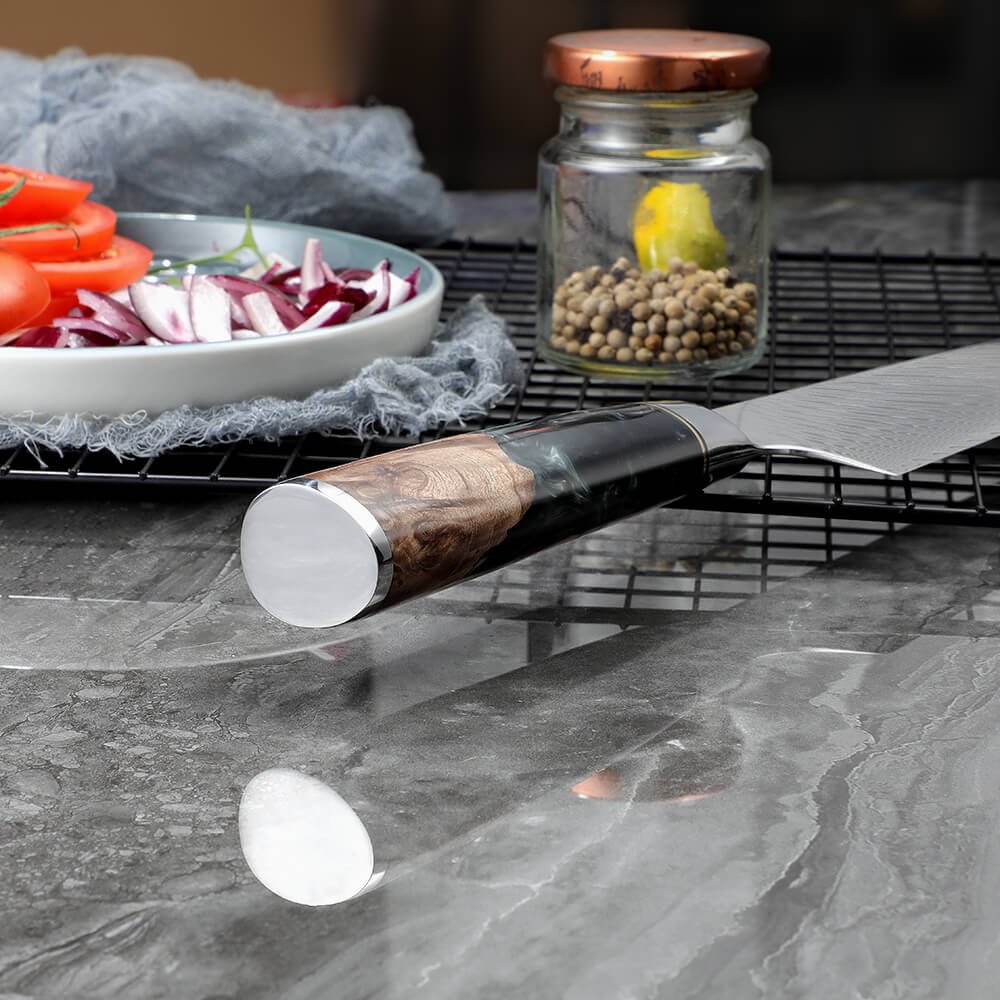 67 Layered Damascus steel with a VG-10 Super Steel core. The Japanese Executive Gyuto Chef Knife has an 8 / 210mm long razor sharp blade. from tip to heel and a distinct black resin. stabilized wood handle.