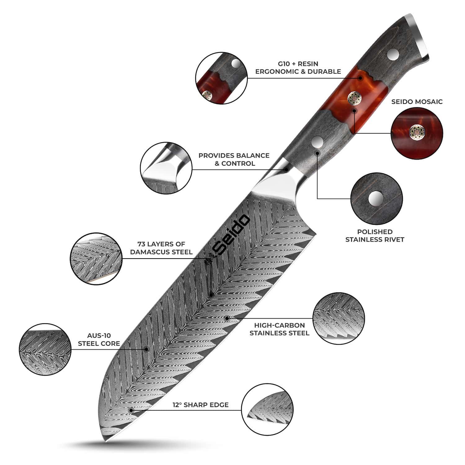 • AUS-10 steel core with 73-layer Damascus cladding for strength. sharpness. and durability