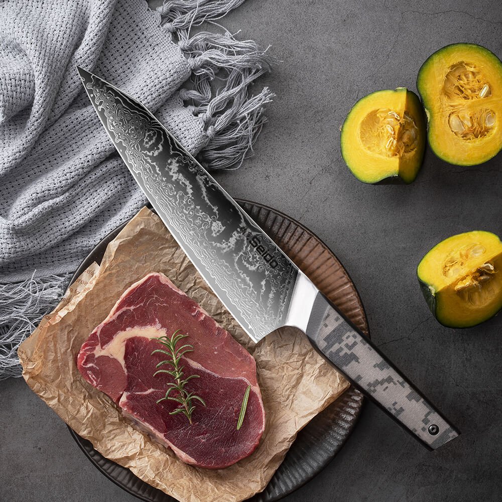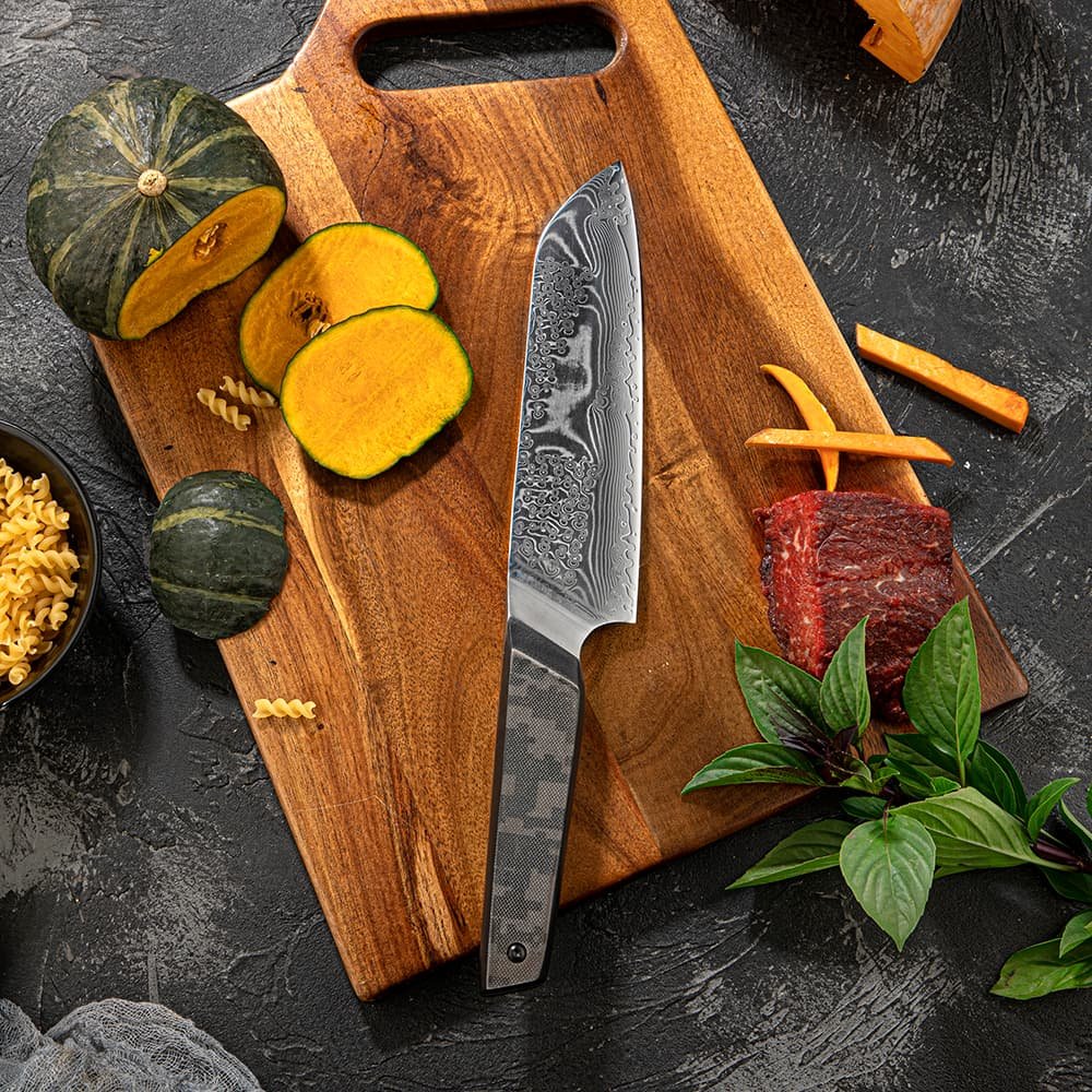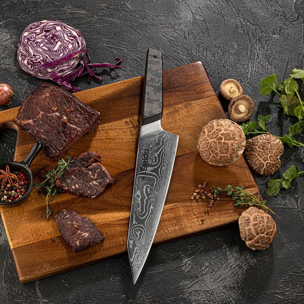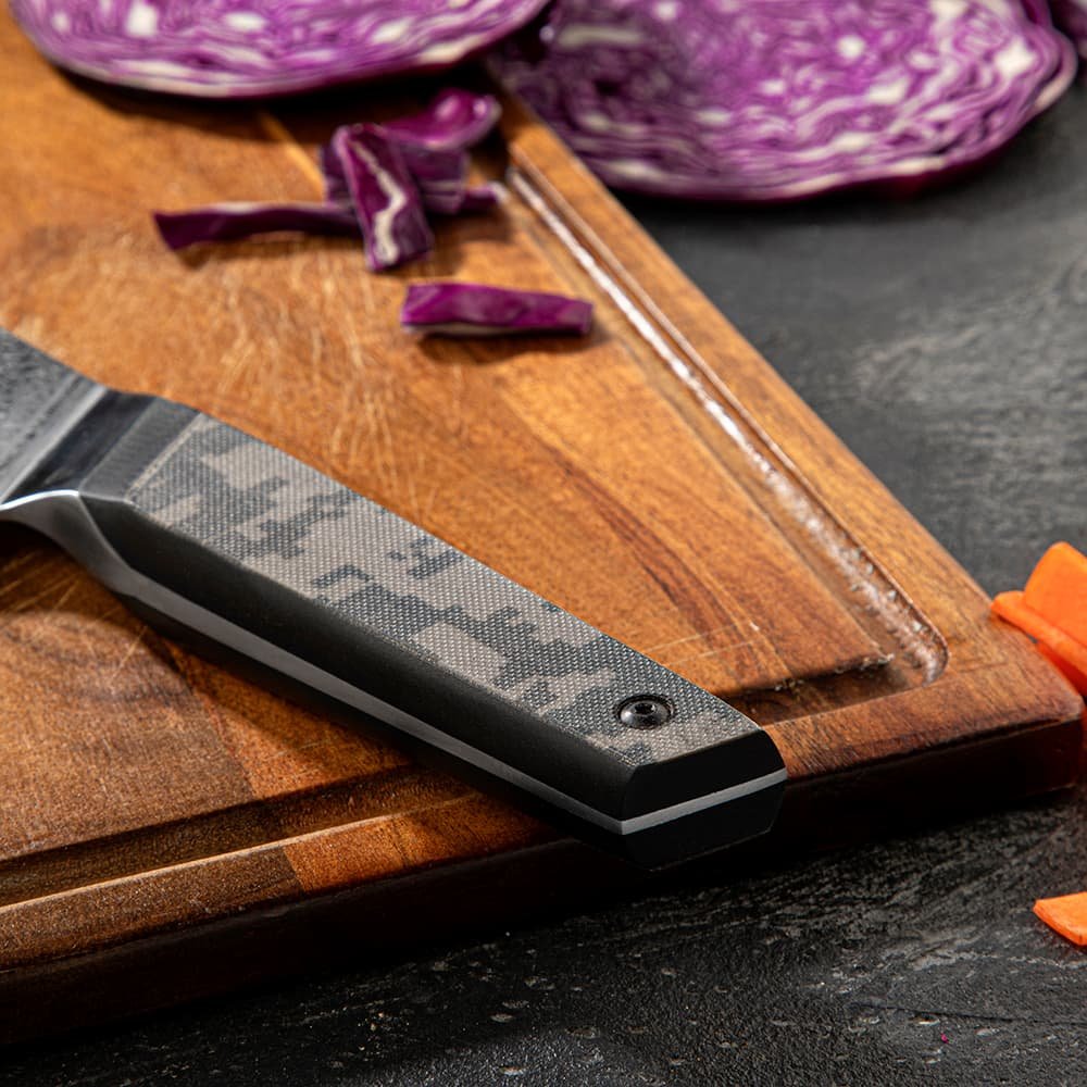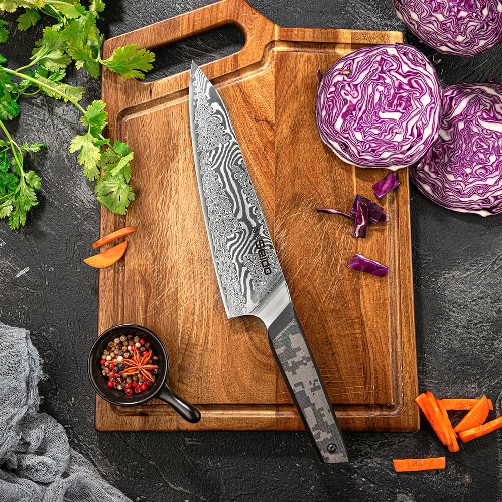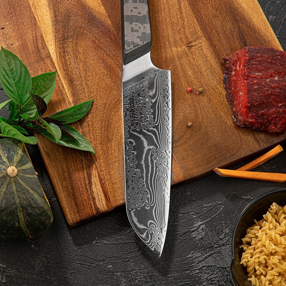 This five-piece Meisai chef knife set features 67 layers of pure Damascus steel and a VG-10 high carbon super steel core. granting it a 60 HRC toughness hardness rating and exceptional edge retention. Its double bevel blade is sharpened to 12°. enabling it to slice effortlessly through ingredients. Additionally. the camouflauge handle is made of G10+ high-pressure fiberglass. offering resilience and a lightweight feel for optimal performance.