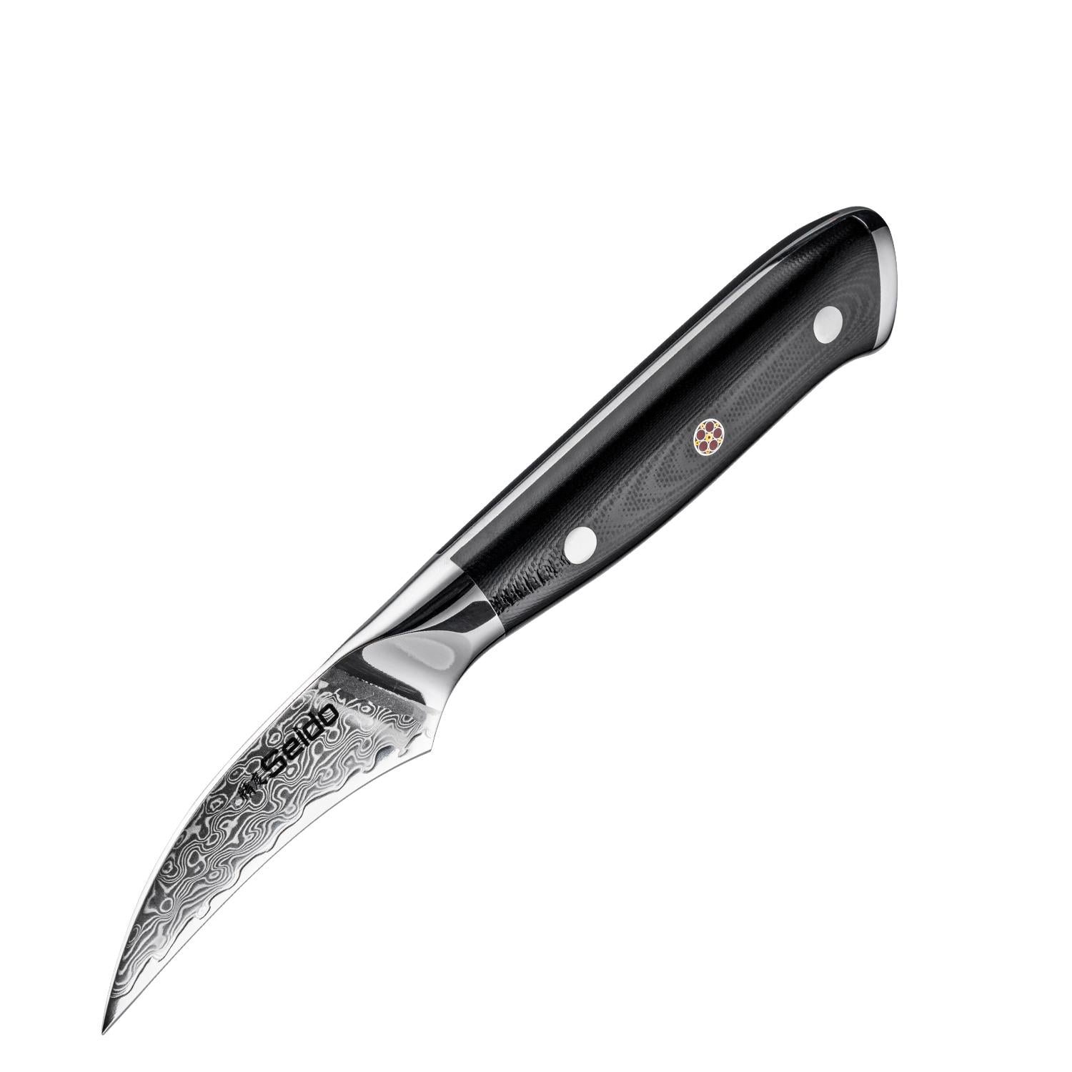 | Edge Style | Bird’s beak: double-bevel concave edge (~12°/side) Straight-edge: double-bevel (~12°/side) Serrated parer: fine micro-serrations |