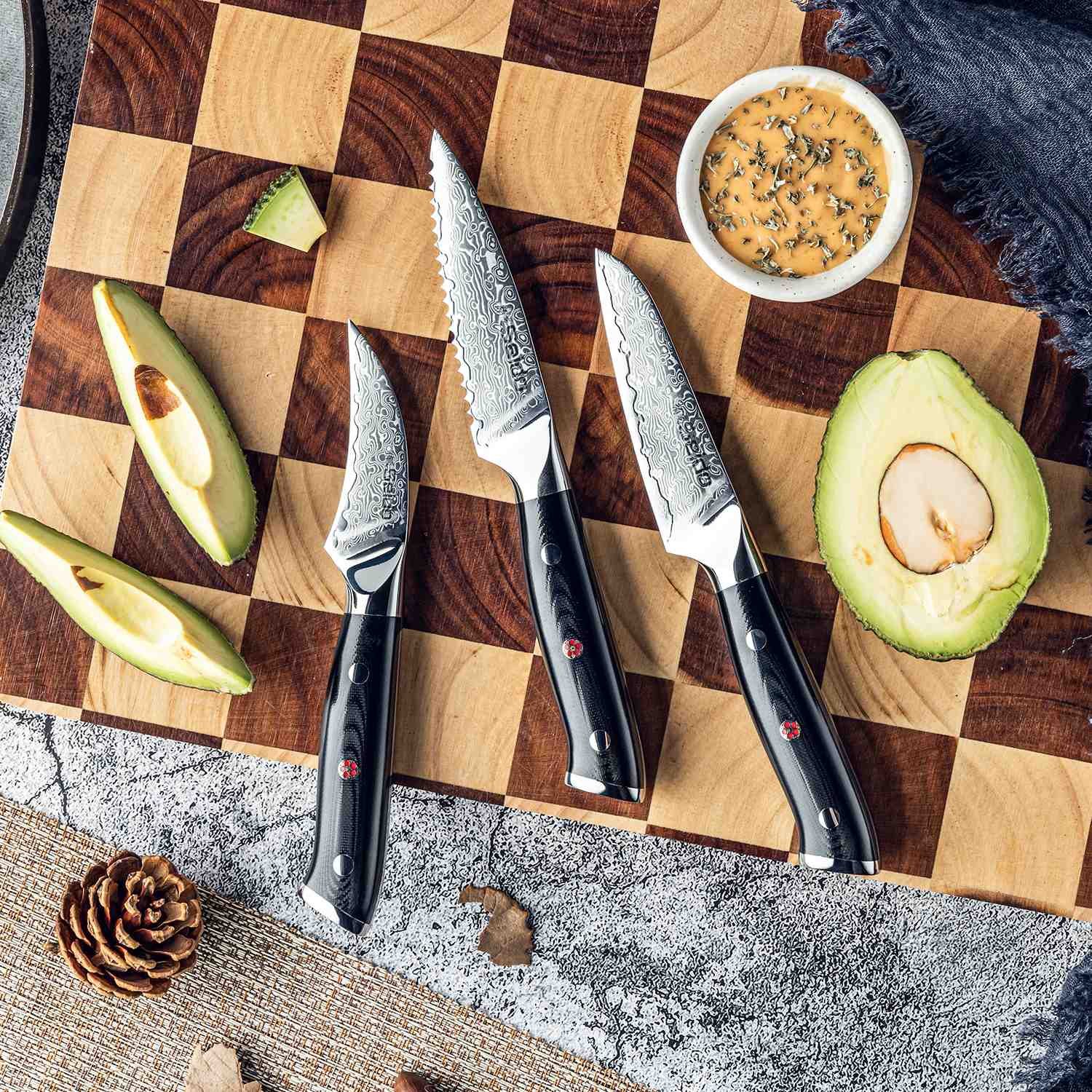 | Set Type | 3-Piece Paring Knife Set (bird’s beak. straight-edge. serrated) |