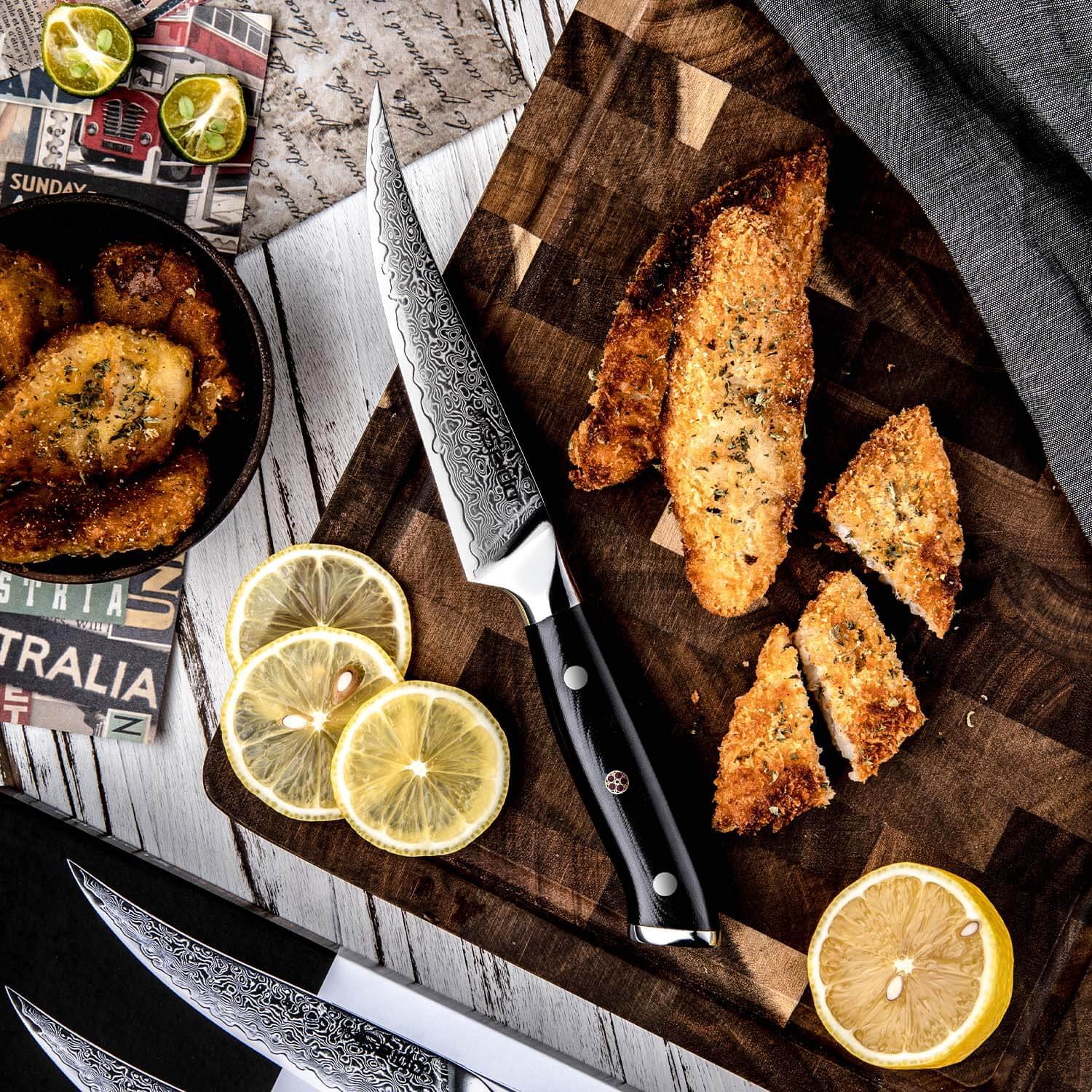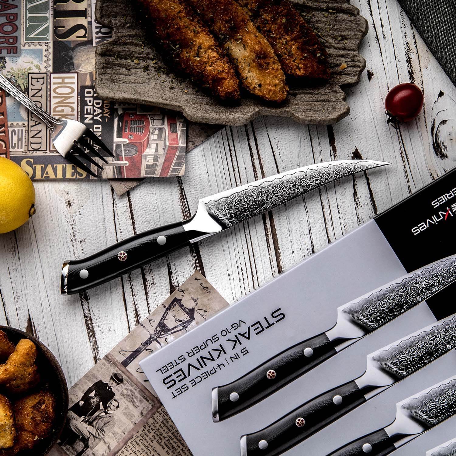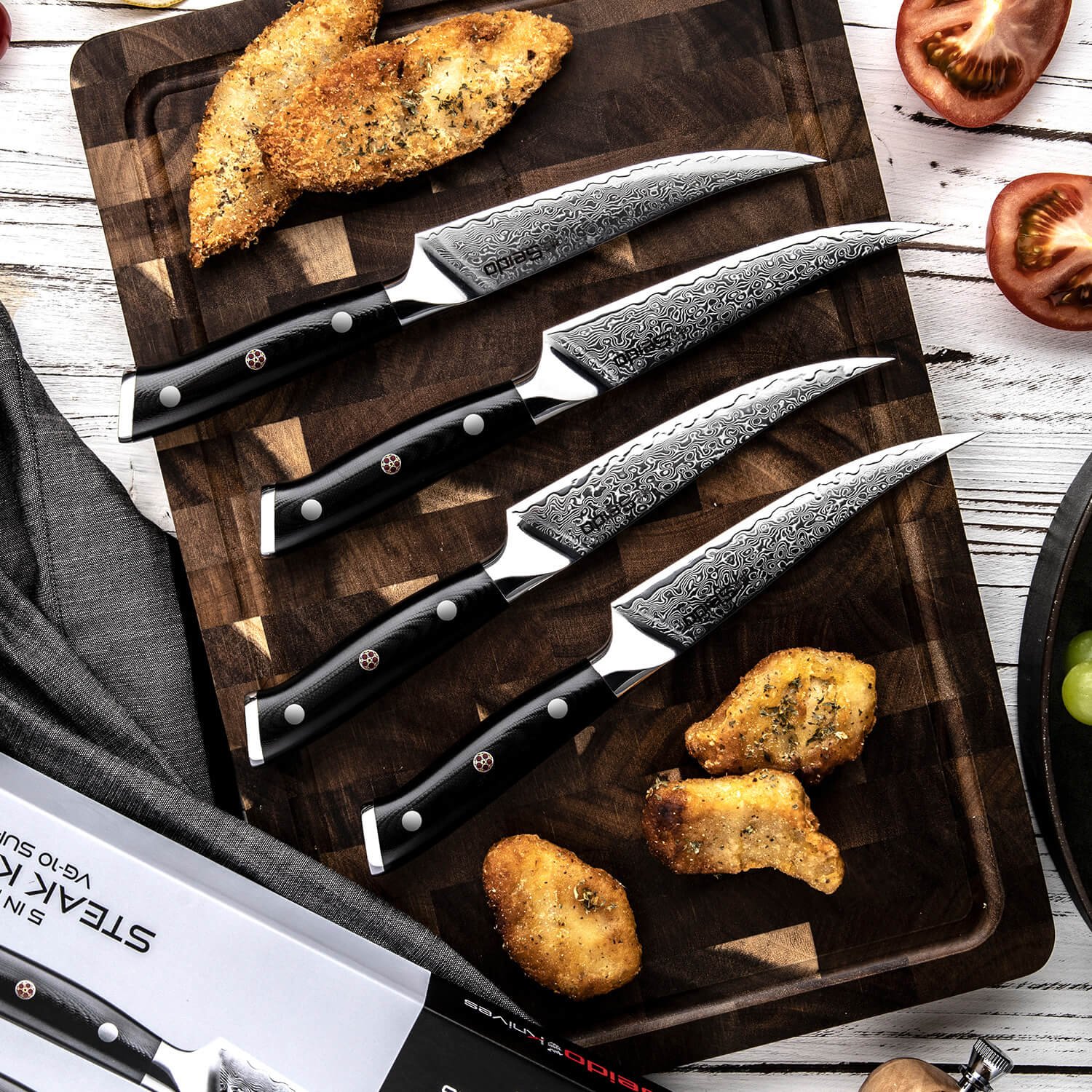 Support from 8:30 AM to 10:00 PM everydayMeet the Shujin Straight-Edge Steak Knives — elegant table knives finished in 67-layer Damascus steel with ergonomic G10 fiber handles and Seido mosaic pins. The straight edge glides cleanly through steak and other proteins. preserving juices and texture. Choose the perfect size for your table: 4-piece or 8-piece set.