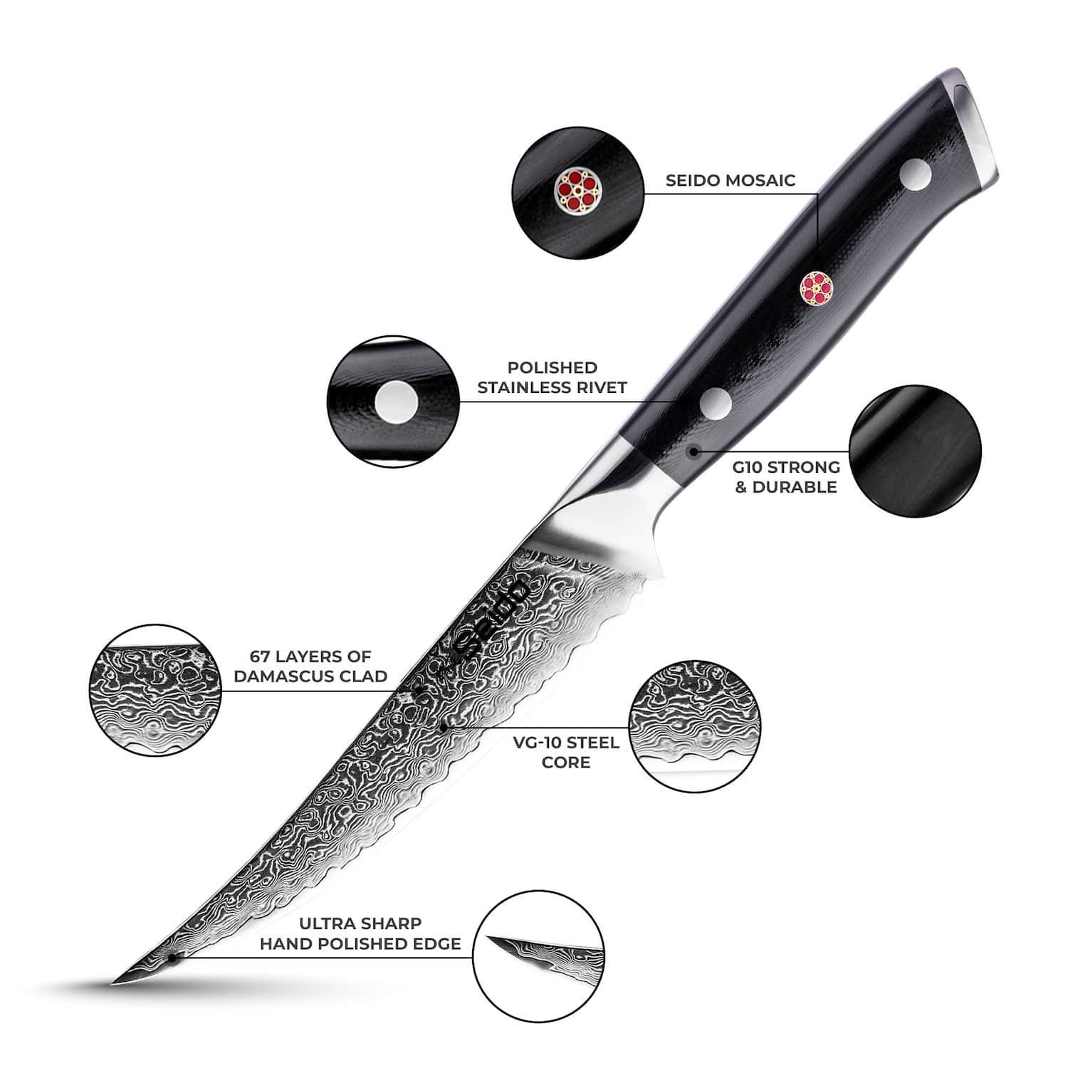 - G10 fiber handle with stainless rivets & Seido mosaic for durability and grip