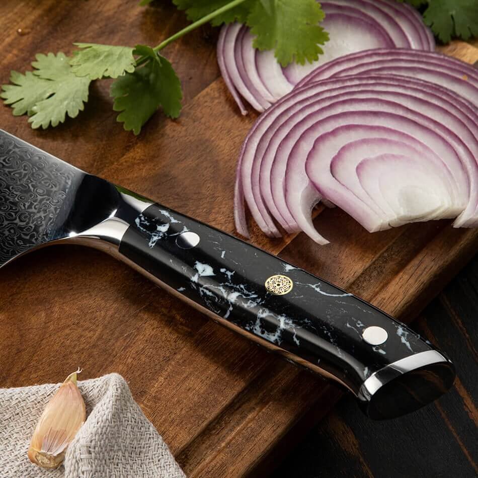 67 Layered Damascus steel with a VG-10 Super Steel cutting core. The Takoizu Gyuto (Chef’s) Knife has an 8 / 205mm long razor sharp blade. from tip to heel and a distinct black turquoise handle.