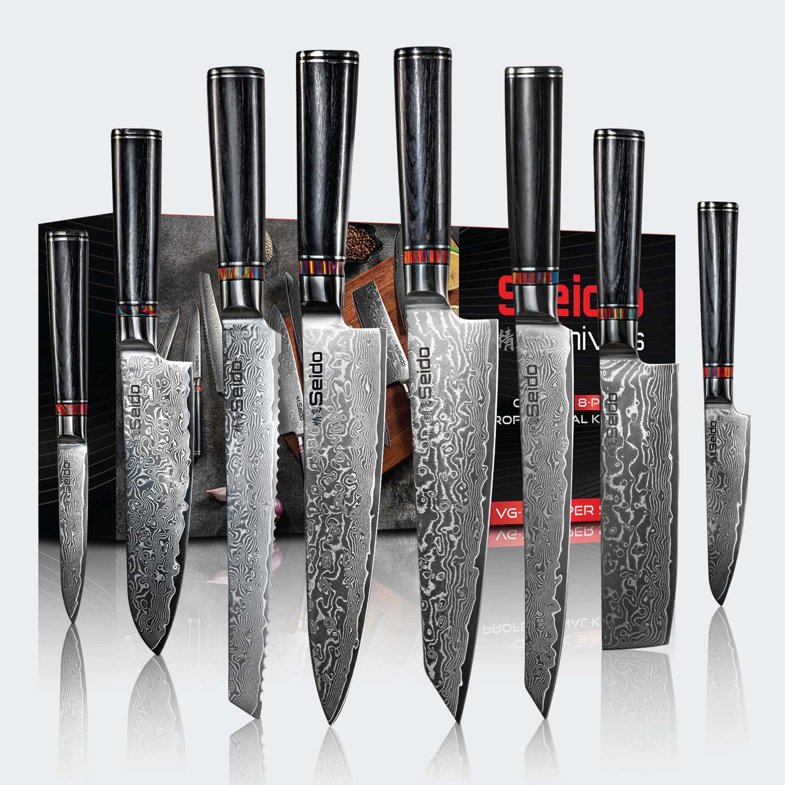 - 8x VG-10 Damascus Steel Knives